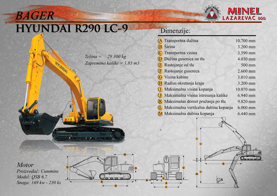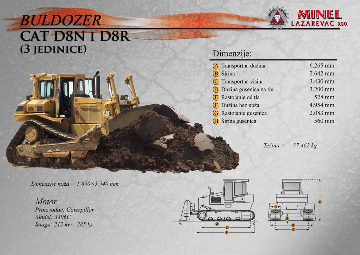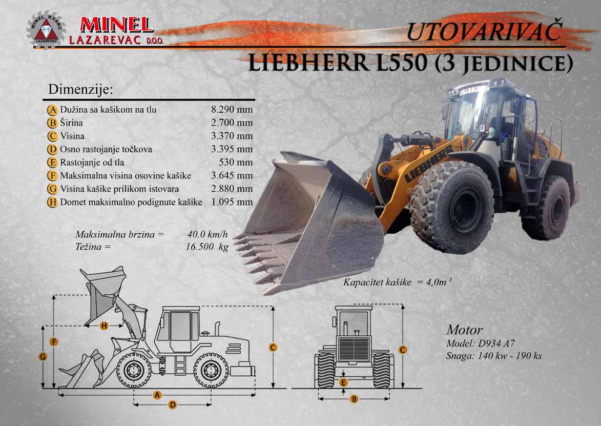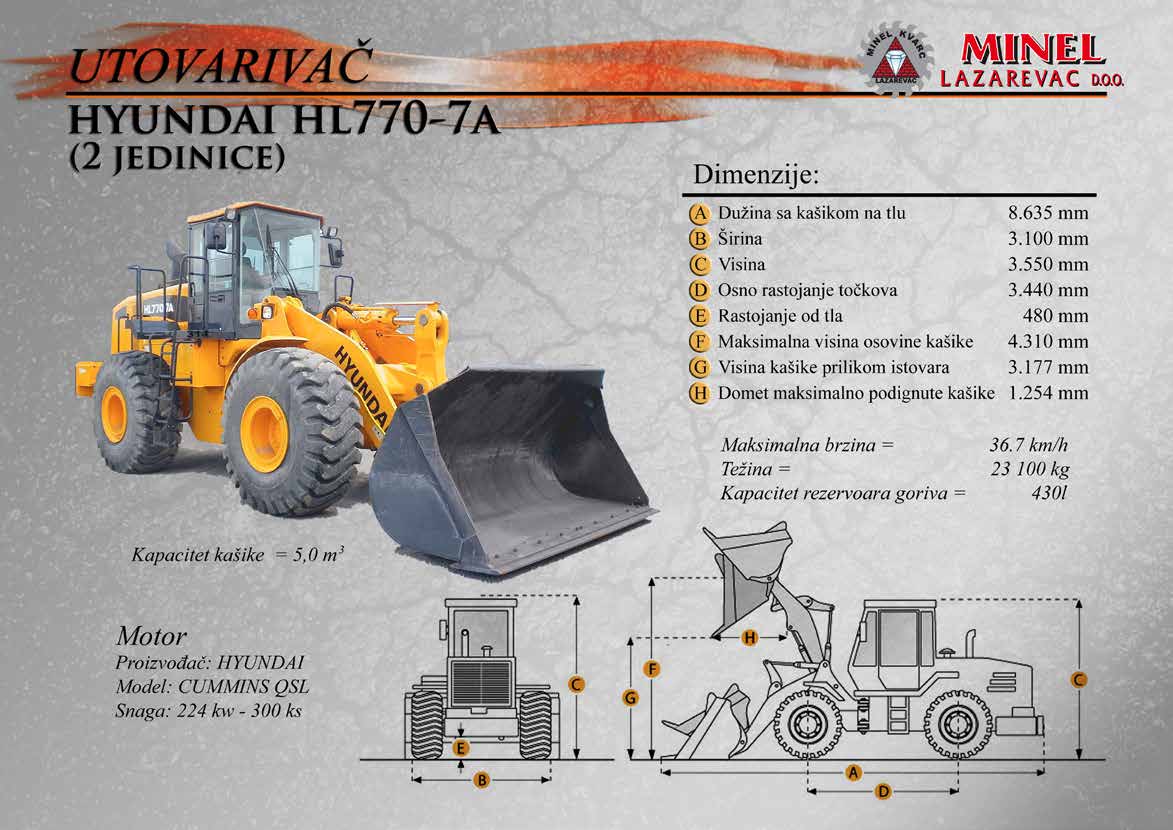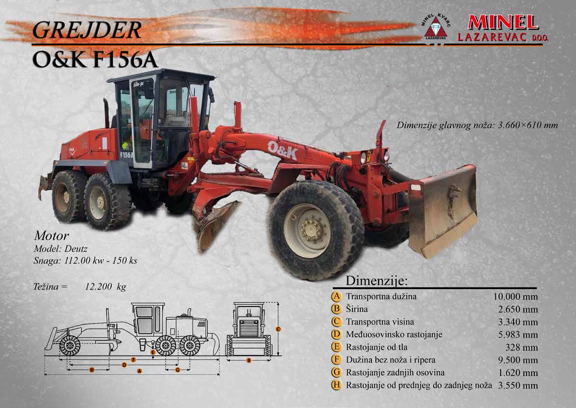 GRAĐEVINSKA MEHANIZACIJA 1 Sve radove izvodimo sopstvenom mehanizacijom koju čine : utovarivači, bageri, buldozeri, damperi, kamioni kiperi, i ostala sredstva. RADNO VREME Ponedeljak – Petak: 8:00 – 16:30 Hrs (Phone until 17:30 Hrs) Subota: 8:00 – 18:30 Hrs Nedelja: 11:00 – 15:00 Hrs (Phone until 16:30 Hrs) NAŠA ADRESA Karađorđeva 2/4, 11550 Lazarevac, Srbija Telefon: +381 65 2700 222, +381 11 7871 377, +381 69 27 00 222 Email: office@minelkvarc.rs