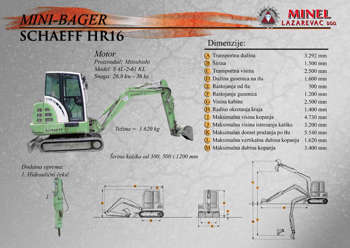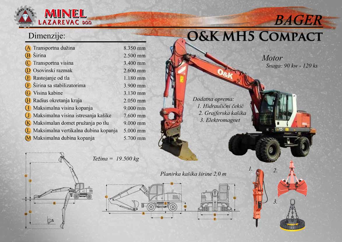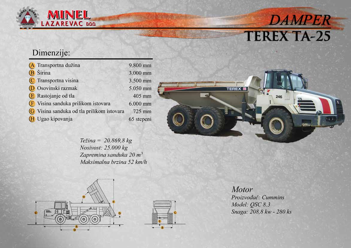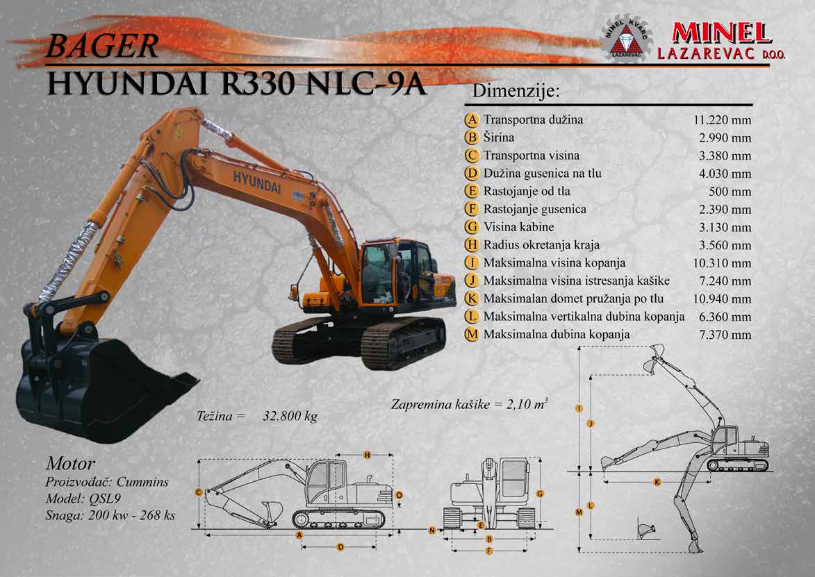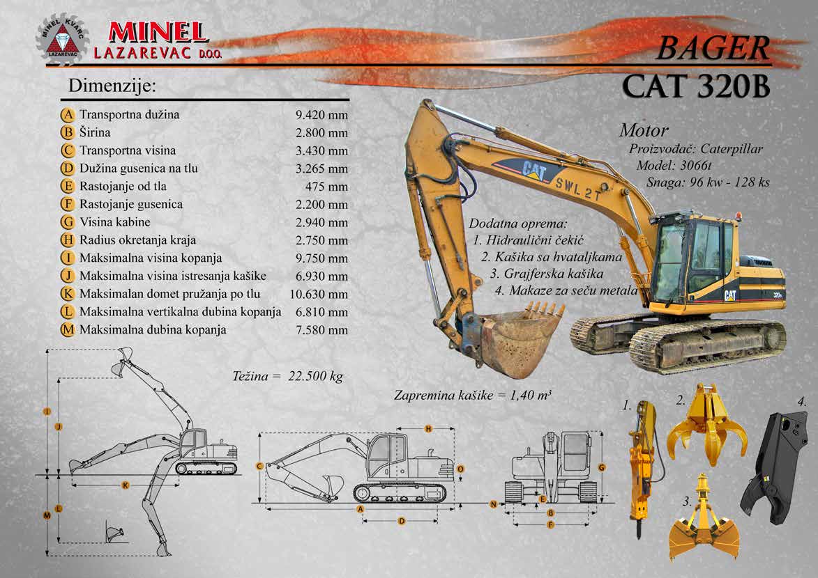 GRAĐEVINSKA MEHANIZACIJA 1 Sve radove izvodimo sopstvenom mehanizacijom koju čine : utovarivači, bageri, buldozeri, damperi, kamioni kiperi, i ostala sredstva. RADNO VREME Ponedeljak – Petak: 8:00 – 16:30 Hrs (Phone until 17:30 Hrs) Subota: 8:00 – 18:30 Hrs Nedelja: 11:00 – 15:00 Hrs (Phone until 16:30 Hrs) NAŠA ADRESA Karađorđeva 2/4, 11550 Lazarevac, Srbija Telefon: +381 65 2700 222, +381 11 7871 377, +381 69 27 00 222 Email: office@minelkvarc.rs